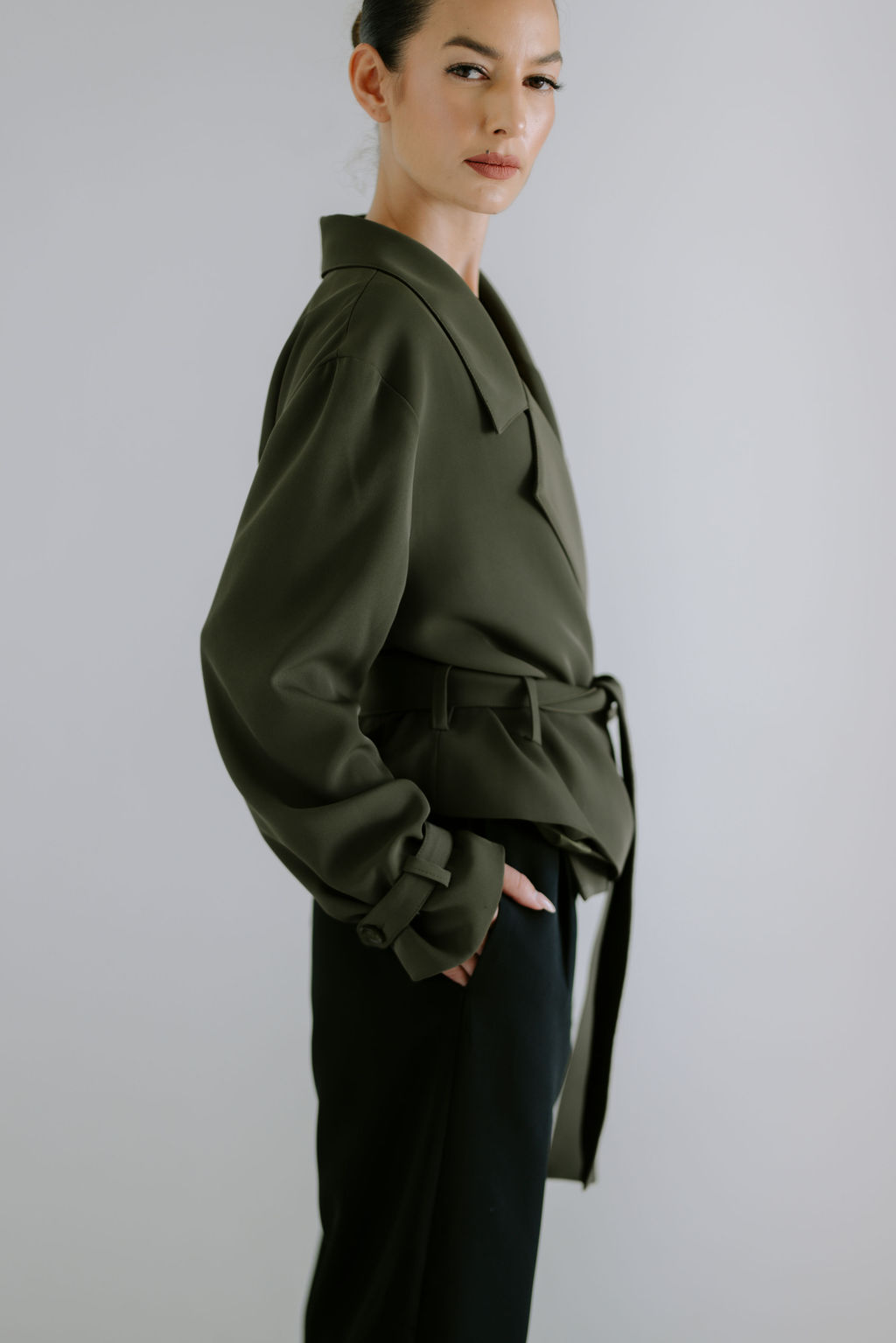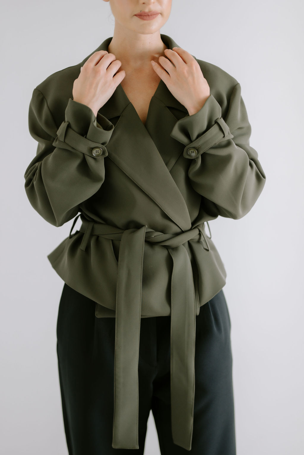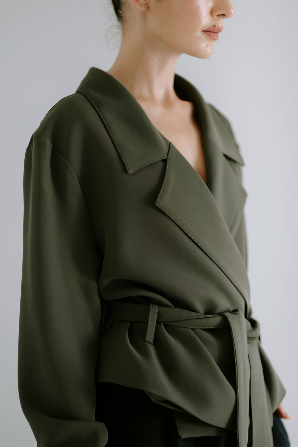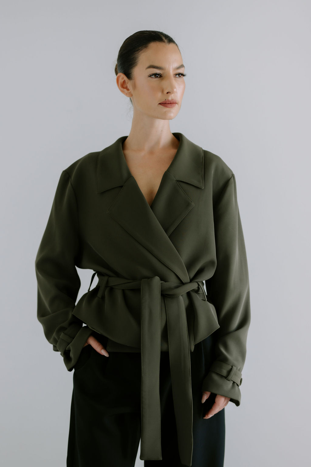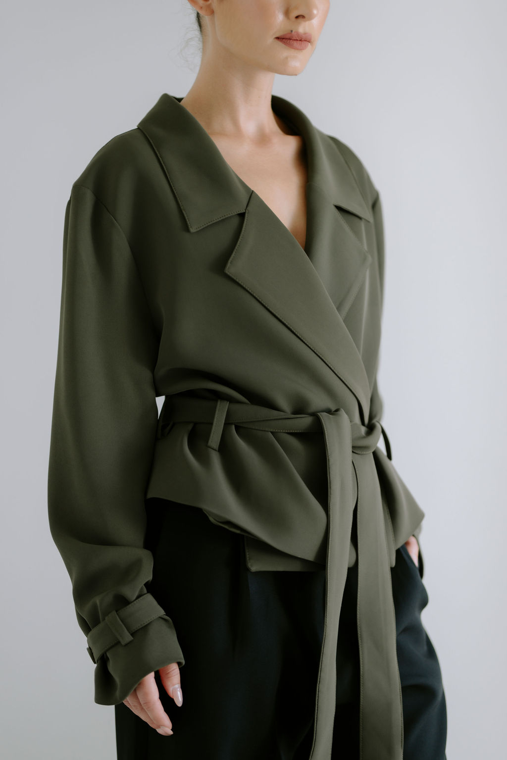 A modern take on a timeless classic. The Cropped Trench Jacket features clean lines, a relaxed silhouette, and a softly structured drape. Designed with a wrap-front and tie belt, it offers effortless versatility—layered or worn as a statement on its own.